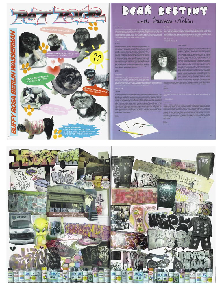 Issues #1-4, published in 2017-2018, feature an incredible group of artists including Rirkrit Tiravanija, Kembra Pfahler, Emma Kohlmann, Ellen Berkenblit, Gogo Graham, Martine Syms, Ari Marcopoulos, Pretty Sick, Diamond Stingily, Susan Cianciolo, Keegan Dakkar Lomanto, Alake Shilling, Aidan Koch's pet snake, an advice column with Princess Nokia… the list goes on and on!