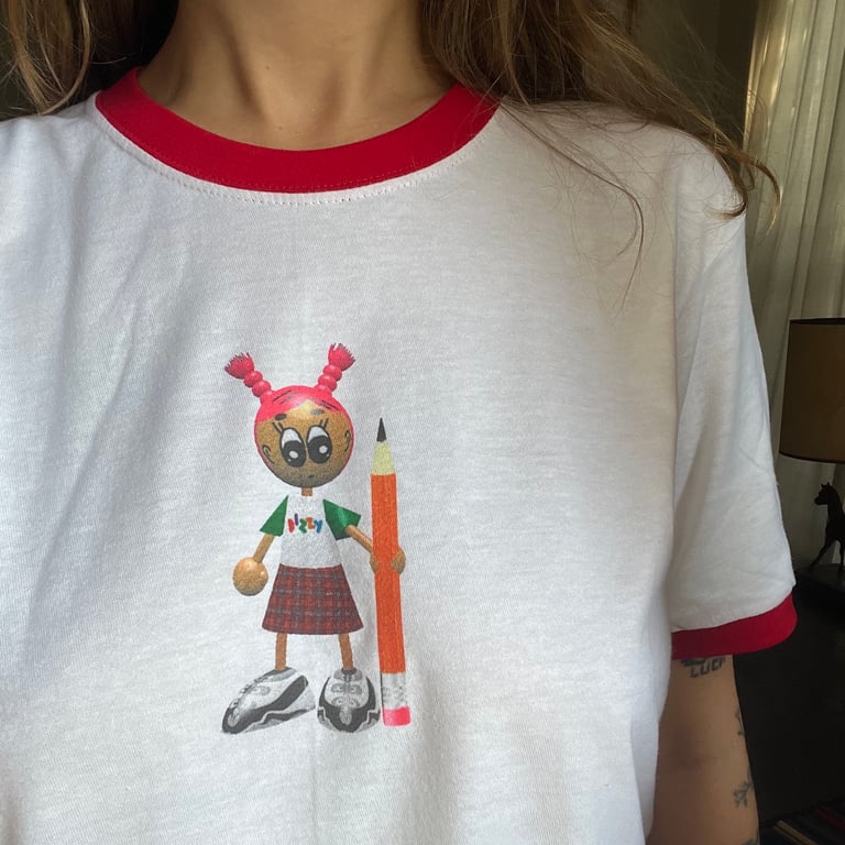 White ringer t-shirt with red arm and neck bands featuring our classic Dizzy Girl mascot.