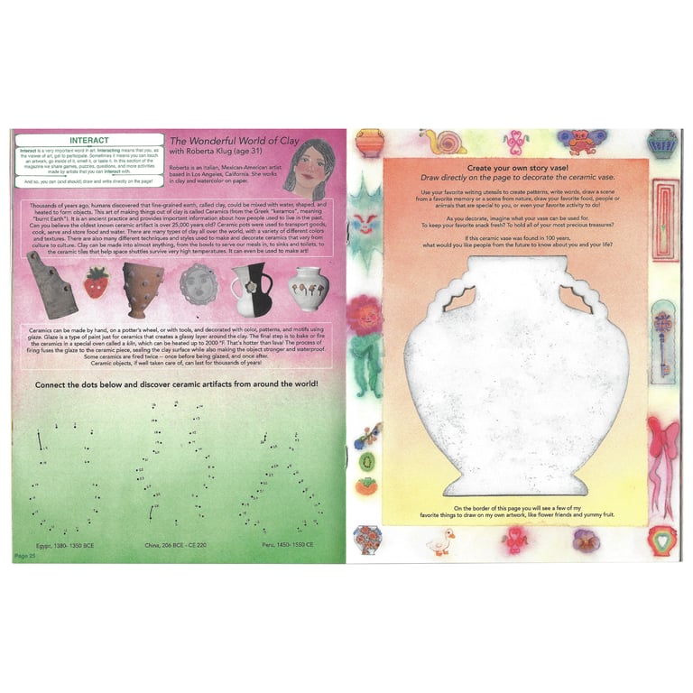 Mishou is an ALL AGES magazine, highlighting work by artists ages 15 and under, collaborations between generations, and interactive sections. Mishou aims to validate children's identities as individuals and artists, and encourage intergenerational engagement through the arts. 50% of each issue is donated to schools and non-profit organizations centered around early childhood arts education.