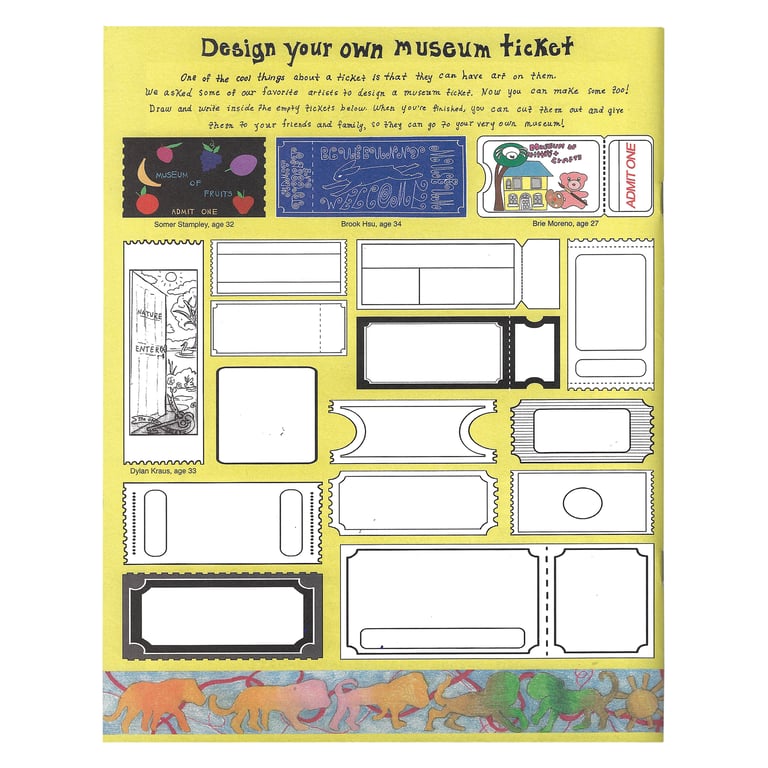 This issue’s theme is inspired by museums. Museums are filled with all sorts of things, from fossils, to furniture, to fashion. A lot of them are used to show and teach people about art, and can also be a space where the art is kept safe, so that humans can look at it for many years. Sometimes museums are in buildings, big or small. Sometimes they cost money to enter, and sometimes they are free. Sometimes you can take classes, or a tour. We hope that now, and in the future, museums will be open to everyone! At Mishou, we think that anyone can start a museum. If there is one topic you’re super interested in, you can create a museum all about that one thing! Since I love warbler birds, maybe I will start a “Warbler Museum”, with drawings, videos, sounds… anything that has to do with warblers! Museums can also have bigger ideas, or themes, and include lots of different things that fit into that category. For example, an “Art Museum” can include all kinds of art from the past, or the present! An “Archaeology Museum” can show historical objects all the way from dinosaur bones to maps of what Earth looked like thousands of years ago. In this issue of Mishou we want to share with you some unique and special examples of museums. On page 47 you will find the Titanic Historical Society, which has a museum in the back of a jewelry repair shop, and on page 5 there is The Revolving Museum, which makes art projects happen all over the place, by using lots of vehicles called artmobiles! Issue #2 contributors and artists range from age 5 to 48!